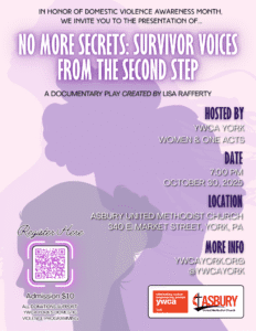 We invite you to an empowering evening with YWCA York and Women & One Acts for the encore documentary play, “No More Secrets: Survivor Voices from The Second Step”, created by Lisa Rafferty. Watch this presentation to be inspired by voices of survivors, raise awareness of the impact of domestic violence in our community, and the importance of supportive services and programming for survivors to heal. Reserve your seat here.